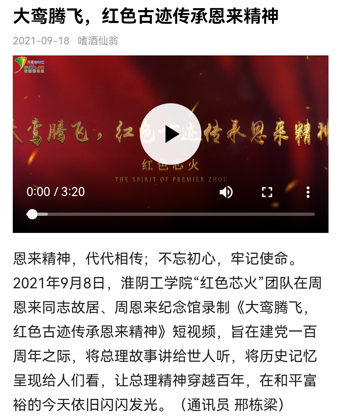 恩来精神,代代相传;不忘初心,牢记使命。2021年9月8日,云顶国际yd333“红色芯火”团队在周恩来同志故居、周恩来纪念馆录制《大鸾腾飞,红色古迹传承恩来精神》短视频,旨在建党一百周年之际,将总理故事讲给世人听,将历史记忆呈现给人们看,让总理精神穿越百年,在和平富裕的今天依旧闪闪发光。(通讯员 邢栋梁)