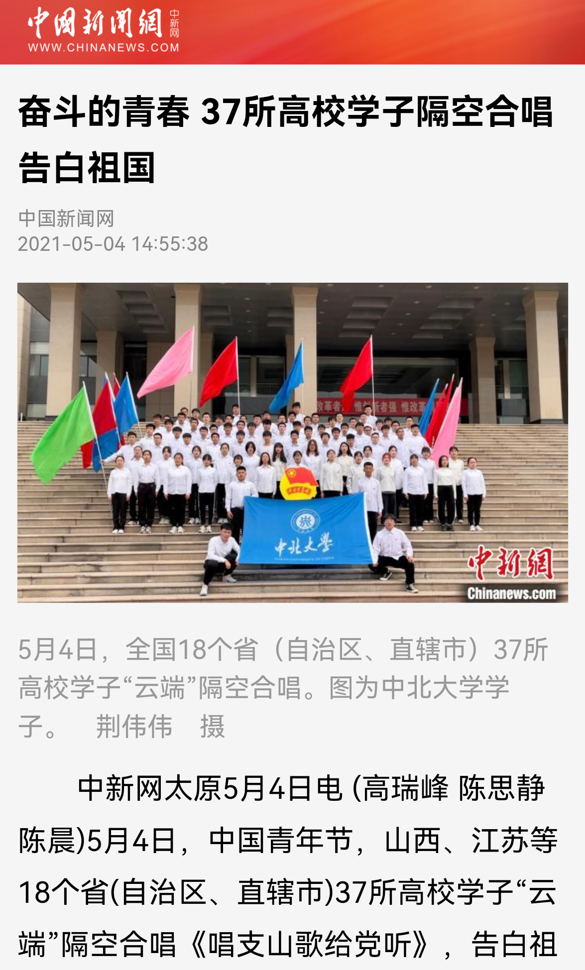中新网太原5月4日电 (高瑞峰 陈思静 陈晨)5月4日,中国青年节,山西、江苏等18个省(自治区、直辖市)37所高校学子“云端”隔空合唱《唱支山歌给党听》,告白祖国,抒发报国之志。