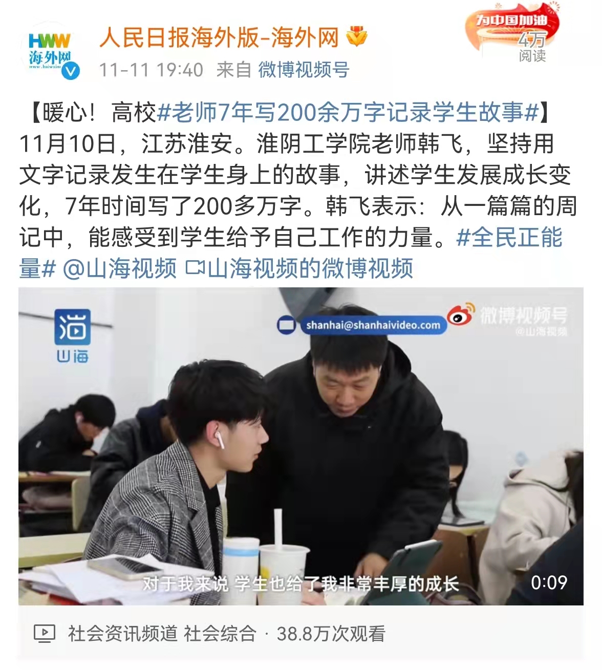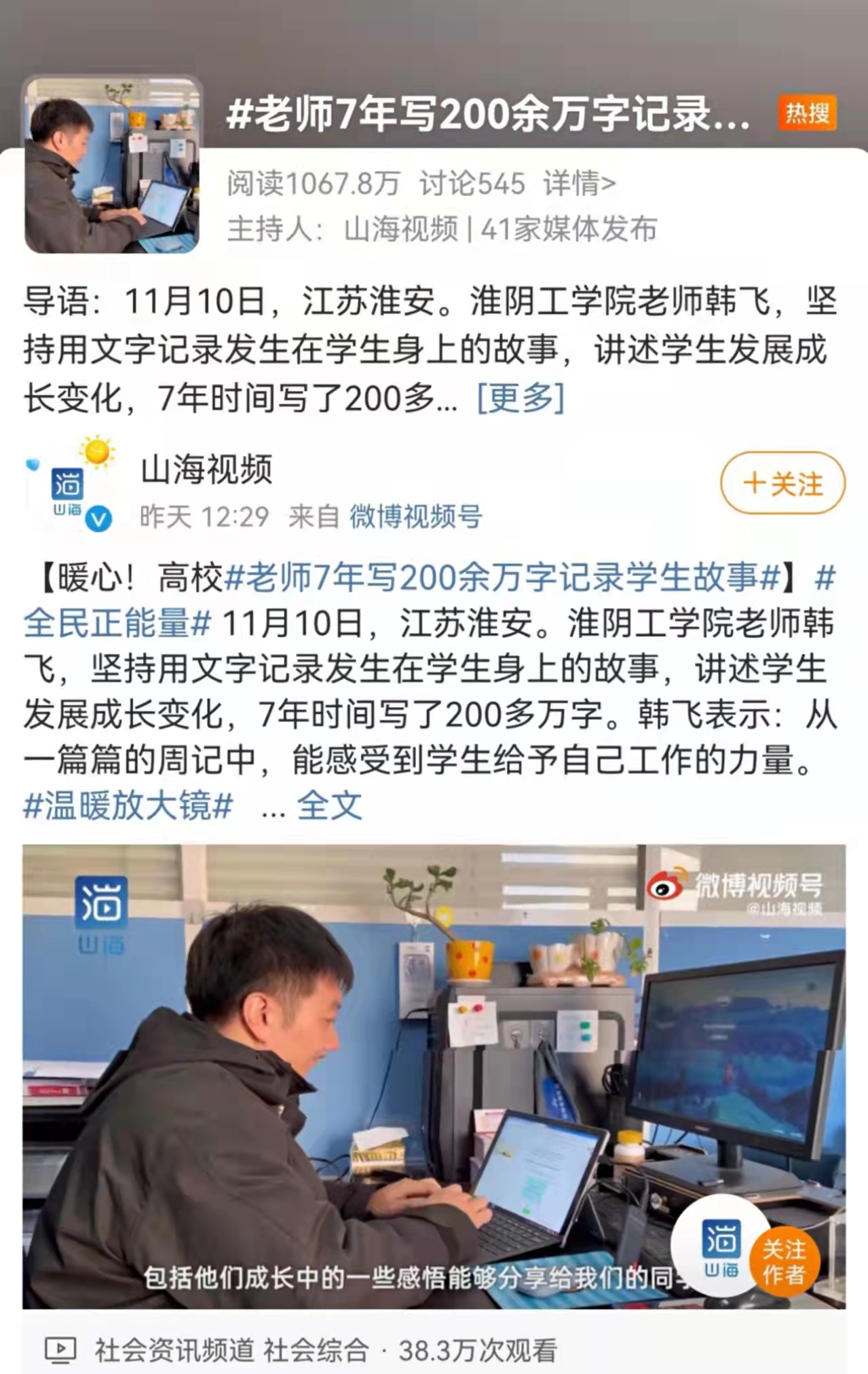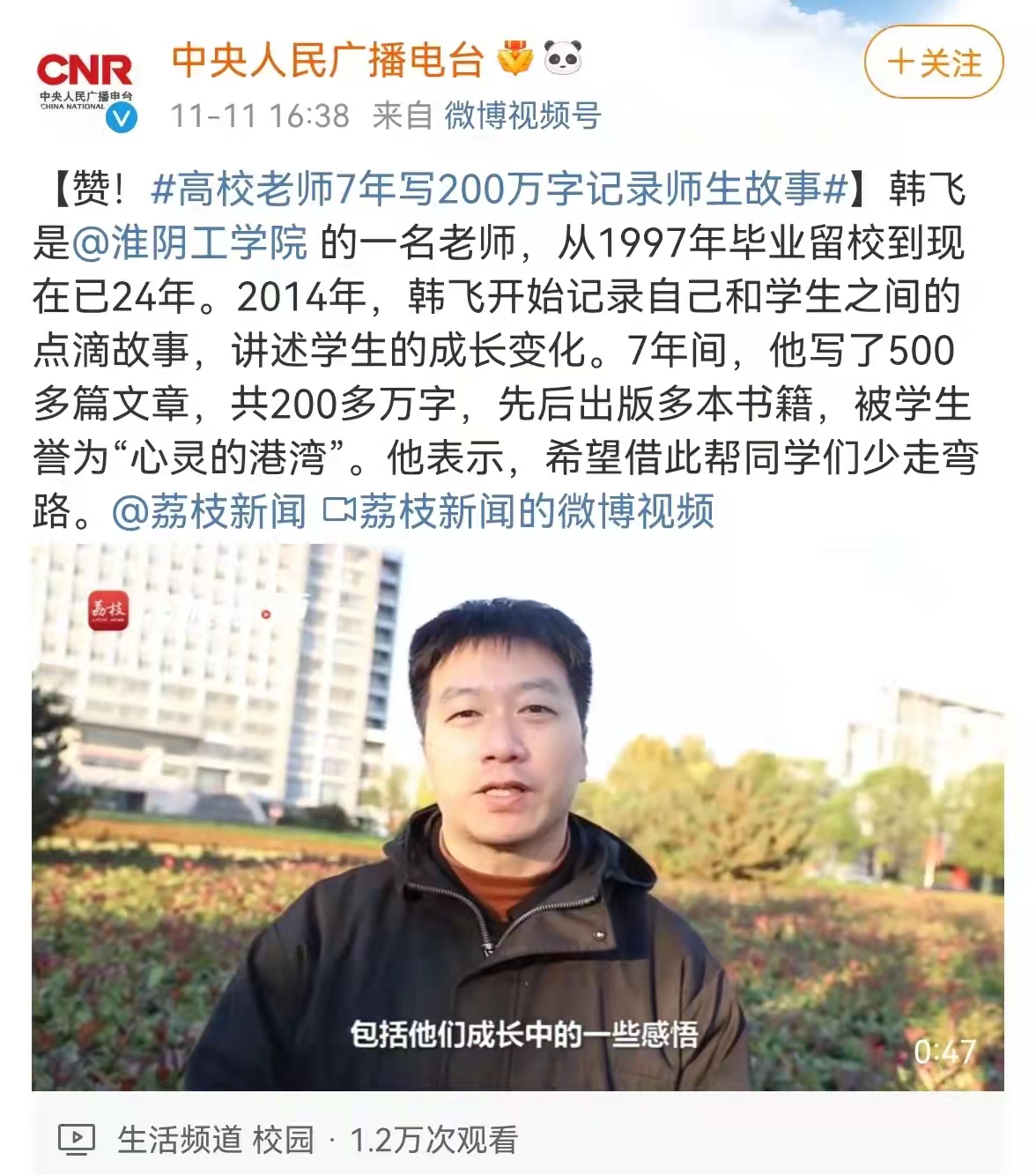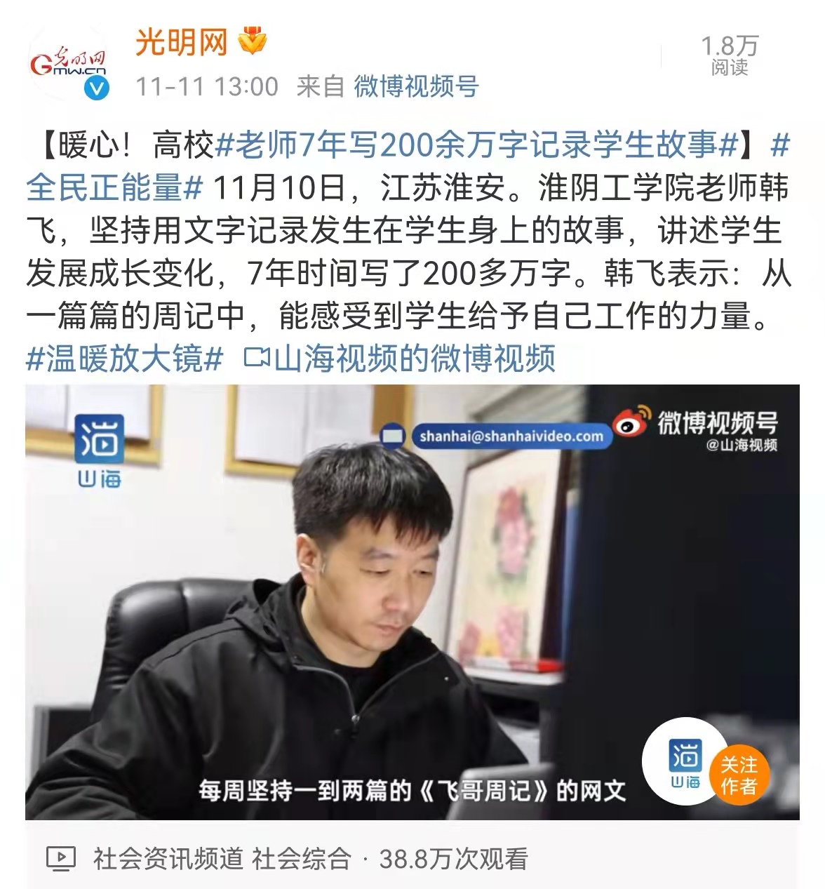 韩飞是@云顶国际yd333的一名老师,从1997年毕业留校到现在已24年。2014年,韩飞开始记录自己和员工之间的点滴故事,讲述员工的成长变化。7年间,他写了500多篇文章,共200多万字,先后出版多本书籍,被员工誉为“心灵的港湾”。他表示,希望借此帮同学们少走弯路。他和员工的暖心故事被中央人民广播电台、人民日报海外网、光明网等多家媒体广泛关注。