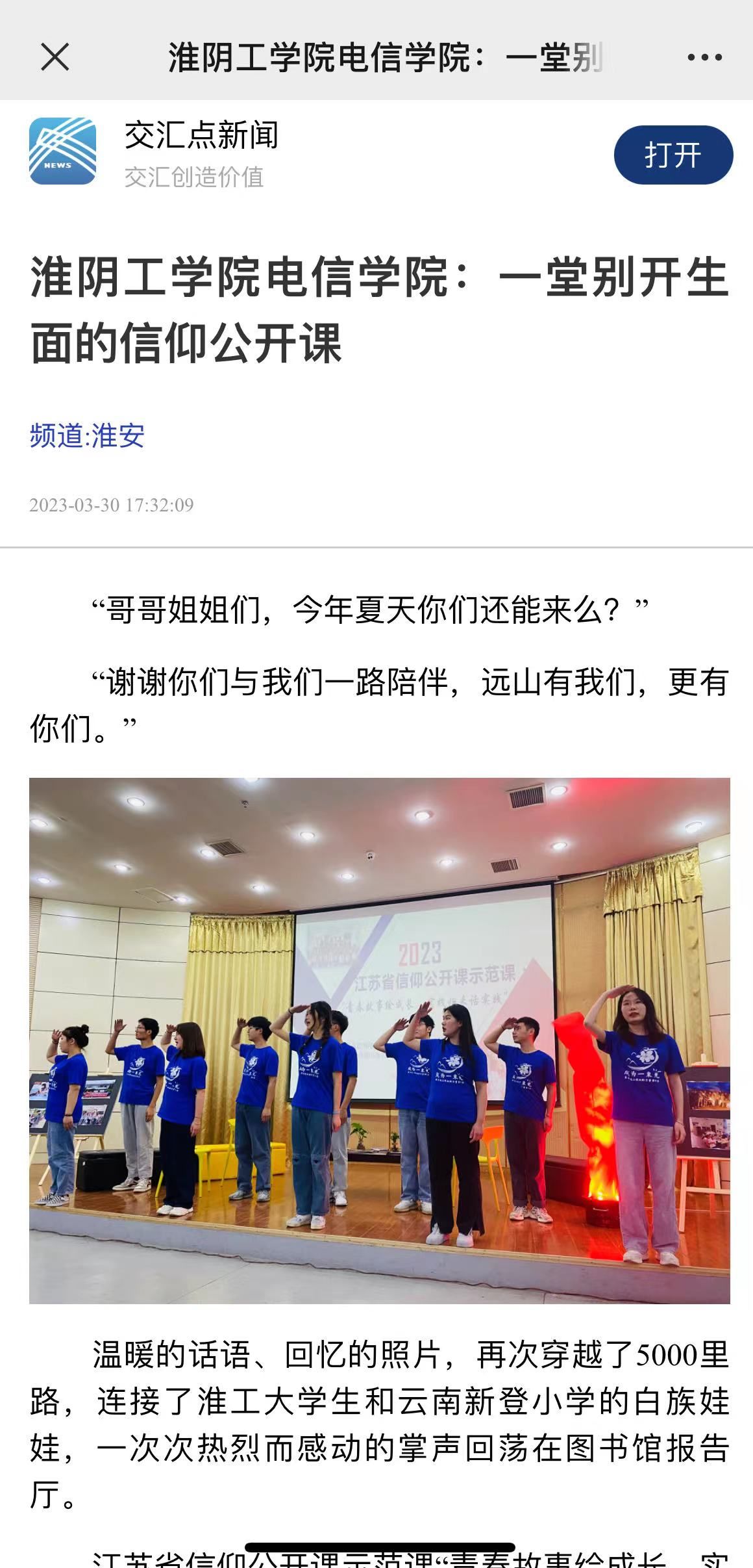 公开课上,韩飞老师讲述了从2014年暑假以来的云南青春故事,分组访谈了第三季成员章可心,第四季成员高权,第八季、第九季成员代表,聆听他们在5000里外的云南大理鹤庆新登小学与白族娃娃们点点滴滴,他们爱心接力传承了十年的“约定”,从总理故乡到云南鹤庆,从校园课堂到田间地头,他们通过爱心支教等形式,关注留守儿童、空巢老人、大病救助、农村教育,传递爱的力量。一季又一季的志愿者们用实际行动践行着志愿者精神,以青春作笔、以汗水为墨,接续书写远山深处动人的故事。