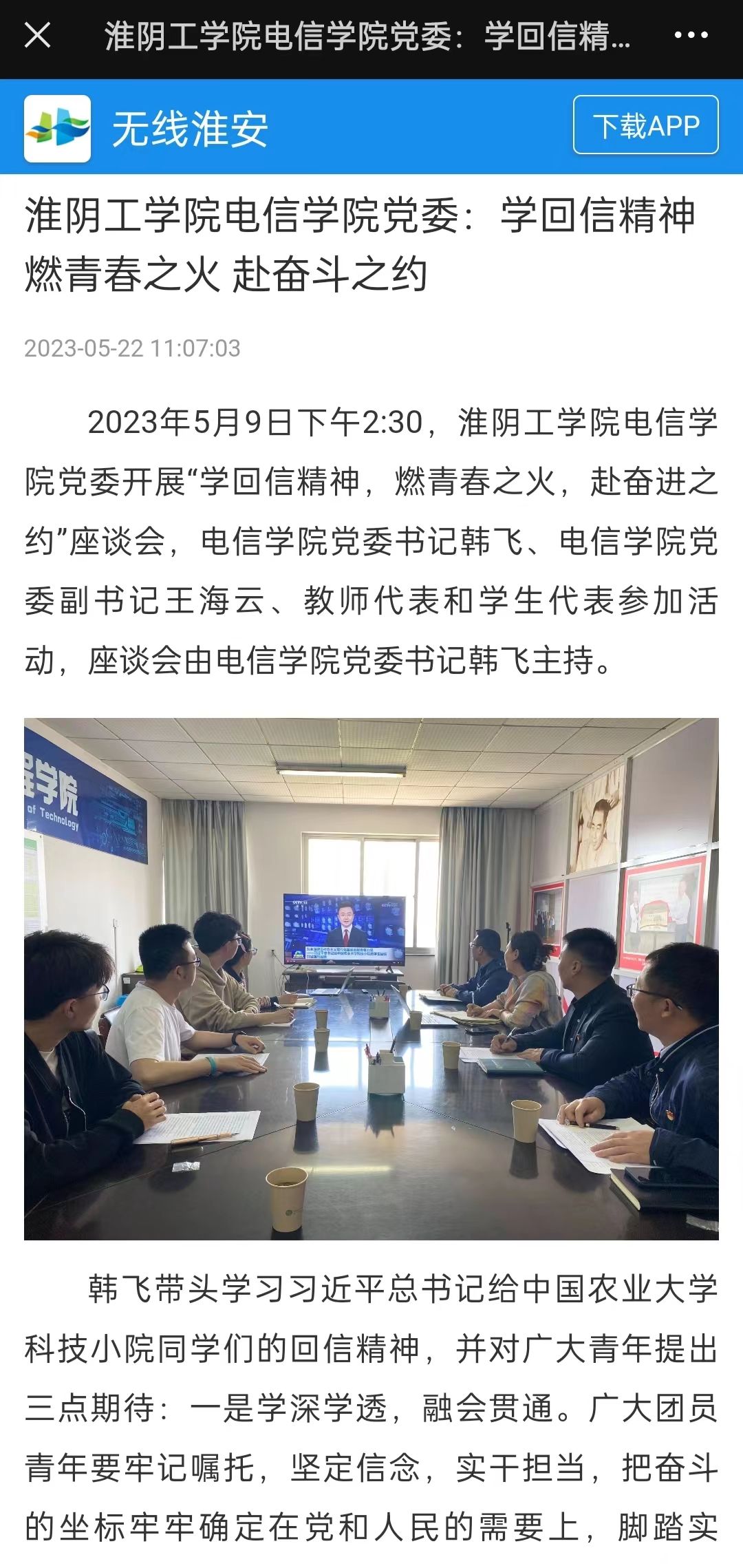 韩飞带头学习习近平总书记给中国农业大学科技小院同学们的回信精神,并对广大青年提出三点期待:一是学深学透,融会贯通。广大团员青年要牢记嘱托,坚定信念,实干担当,把奋斗的坐标牢牢确定在党和人民的需要上,脚踏实地,深耕厚植,让青春之我绽放绚丽之花。二是要知行合一,笃行不怠。广大团员青年要练就新时代中国青年的“精气神”,做学思践悟新思想的“追光者”,结合主题教育以学铸魂、以学增智、以学正风、以学促干。三是要学以致用,吃苦担当。全院青年师生躬身实干,以“精神满格”状态、“昂扬奋斗”姿态,做逐梦自信人生路的“弄潮儿”,要肯吃苦,会吃苦,敢于、善于、乐于“自找苦吃”,展现积极进取、开拓创新,奋斗奉献的青春风采。