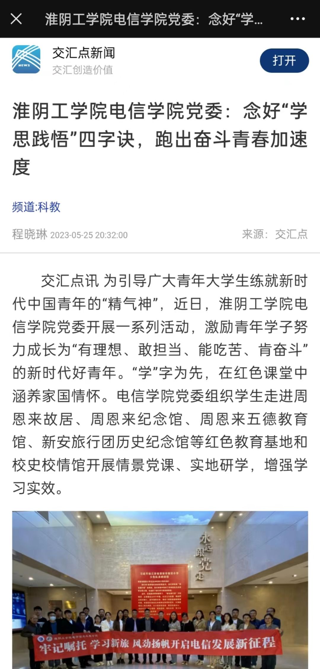 在淮安市新安旅行团历史纪念馆研学活动,毕业班党员、2023年江苏省“乡村振兴计划”老员工志愿者李鑫感慨道:“一群少年在国之危难中挺身而出,抱着“讨饭也要去宣传抗日”的决心踏上抗日征程,历时17年,行程5万余里。可敬可叹!作为乡村振兴服务志愿者,我一定以他们为榜样,肩负起时代赋予的使命,不怕苦不怕难,用行动践行誓言,为乡村振兴工作贡献自己的力量!”