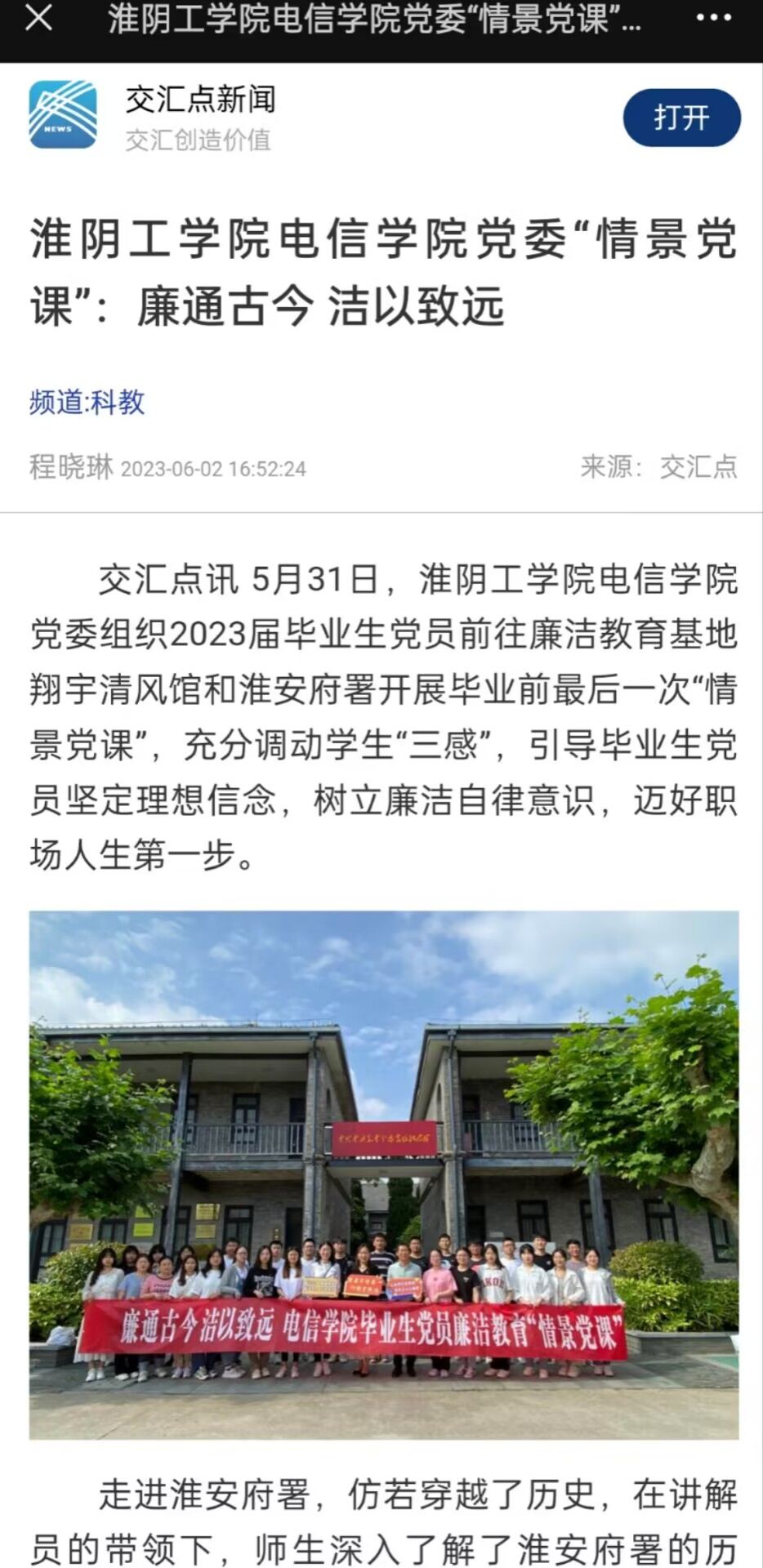 5月31日,云顶国际yd333公司党委组织2023届毕业生党员前往廉洁教育基地翔宇清风馆和淮安府署开展毕业前最后一次“情景党课”,充分调动员工“三感”,引导毕业生党员坚定理想信念,树立廉洁自律意识,迈好职场人生第一步。