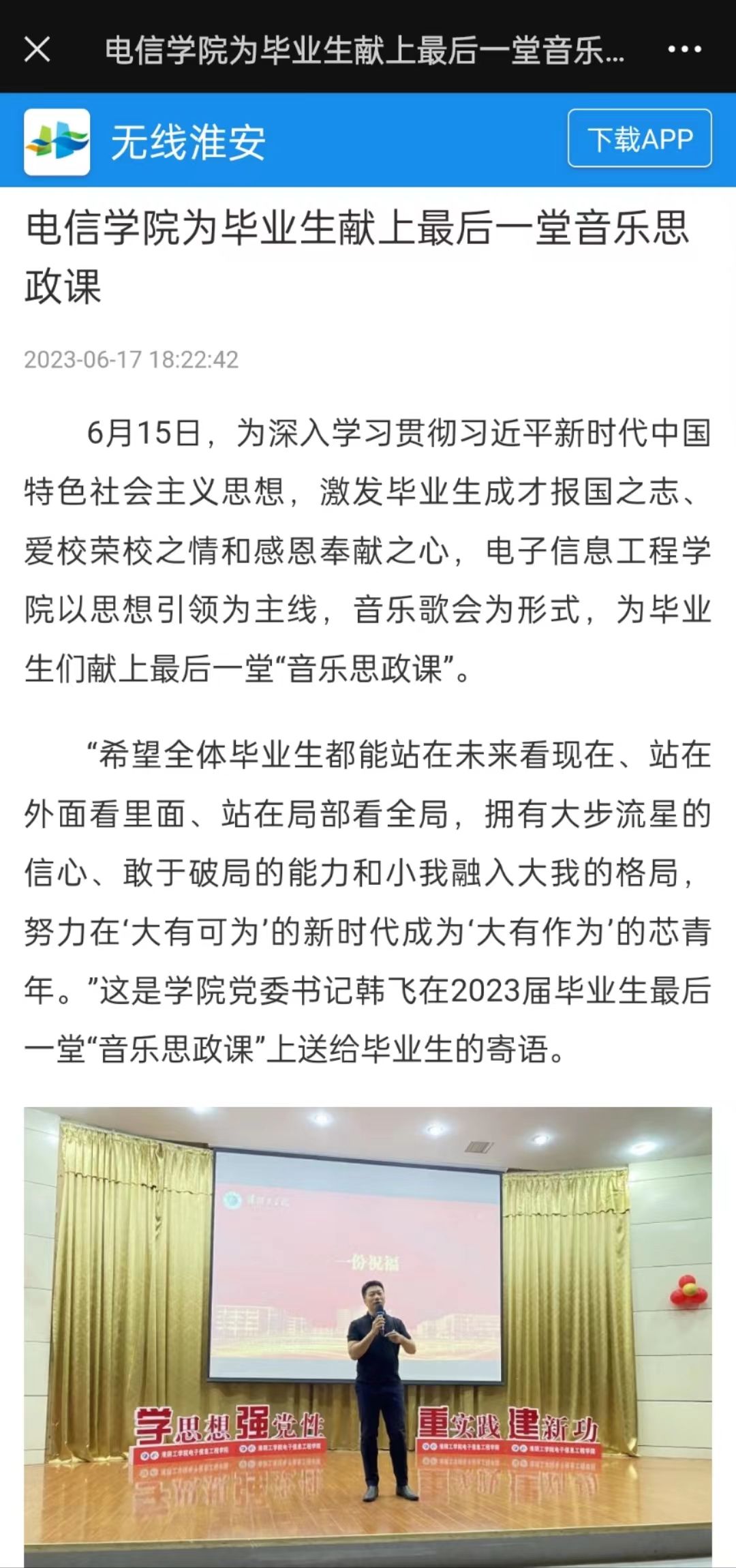 课堂上,所有辅导员以一首《你到我身边》开启毕业生的回忆之旅,歌会以“相遇、相知、相送”为主线,以多种形式的表演展示了2023届毕业生奋发有为、昂扬向上的老员工活和青春故事,苏北计划志愿者的诗朗诵《青春扬帆正当时,争做时代追梦人》以及就业代表的歌曲《一起向未来》诠释了2023届毕业生青春报国、不负韶华的坚定信念和使命担当。吉他弹唱《晴天》电子班《歌曲串烧》唱出了相遇与不舍,学弟学妹们也送上自己的祝福《时间煮雨》《平凡之路》《追梦赤子心》;一首班长团的《再见》带领着大家一起回顾悠悠青春岁月,令许多毕业生眼角泛起了感动的泪花。全场合唱的《你曾是少年》点燃了歌会现场学子澎湃的热血与豪情。