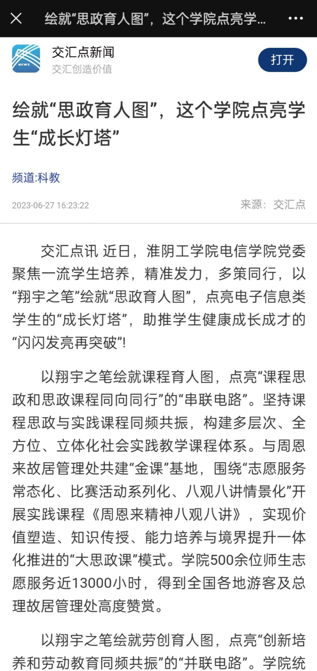 以翔宇之笔绘就课程育人图,点亮“课程思政和思政课程同向同行”的“串联电路”。坚持课程思政与实践课程同频共振,构建多层次、全方位、立体化社会实践教学课程体系。与周恩来故居管理处共建“金课”基地,围绕“志愿服务常态化、比赛活动系列化、八观八讲情景化”开展实践课程《周恩来精神八观八讲》,实现价值塑造、知识传授、能力培养与境界提升一体化推进的“大思政课”模式。公司500余位师生志愿服务近13000小时,得到全国各地游客及总理故居管理处高度赞赏。