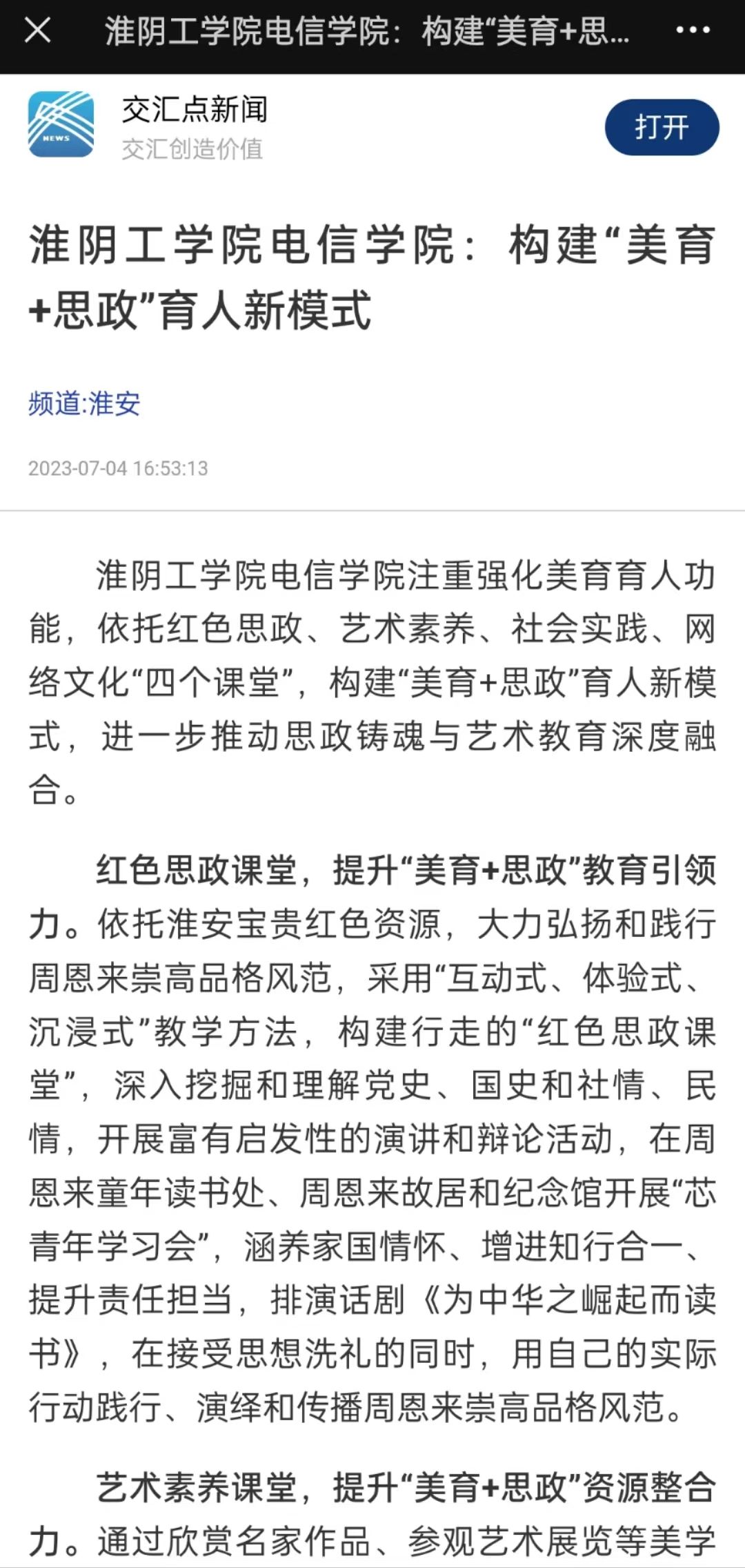 红色思政课堂,提升“美育+思政”教育引领力。依托淮安宝贵红色资源,大力弘扬和践行周恩来崇高品格风范,采用“互动式、体验式、沉浸式”教学方法,构建行走的“红色思政课堂”,深入挖掘和理解党史、国史和社情、民情,开展富有启发性的演讲和辩论活动,在周恩来童年读书处、周恩来故居和纪念馆开展“芯青年学习会”,涵养家国情怀、增进知行合一、提升责任担当,排演话剧《为中华之崛起而读书》,在接受思想洗礼的同时,用自己的实际行动践行、演绎和传播周恩来崇高品格风范。