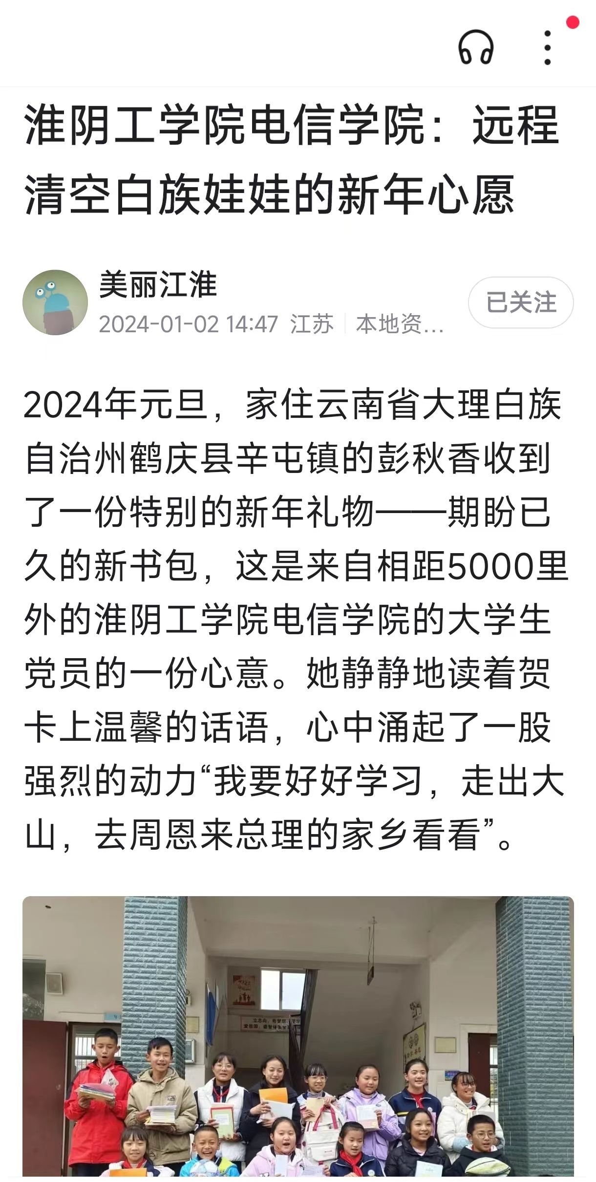 2024年元旦,家住云南省大理白族自治州鹤庆县辛屯镇的彭秋香收到了一份特别的新年礼物——期盼已久的新书包,这是来自相距5000里外的云顶国际yd333云顶国际yd333的老员工党员的一份心意。她静静地读着贺卡上温馨的话语,心中涌起了一股强烈的动力“我要好好学习,走出大山,去周恩来总理的家乡看看”。