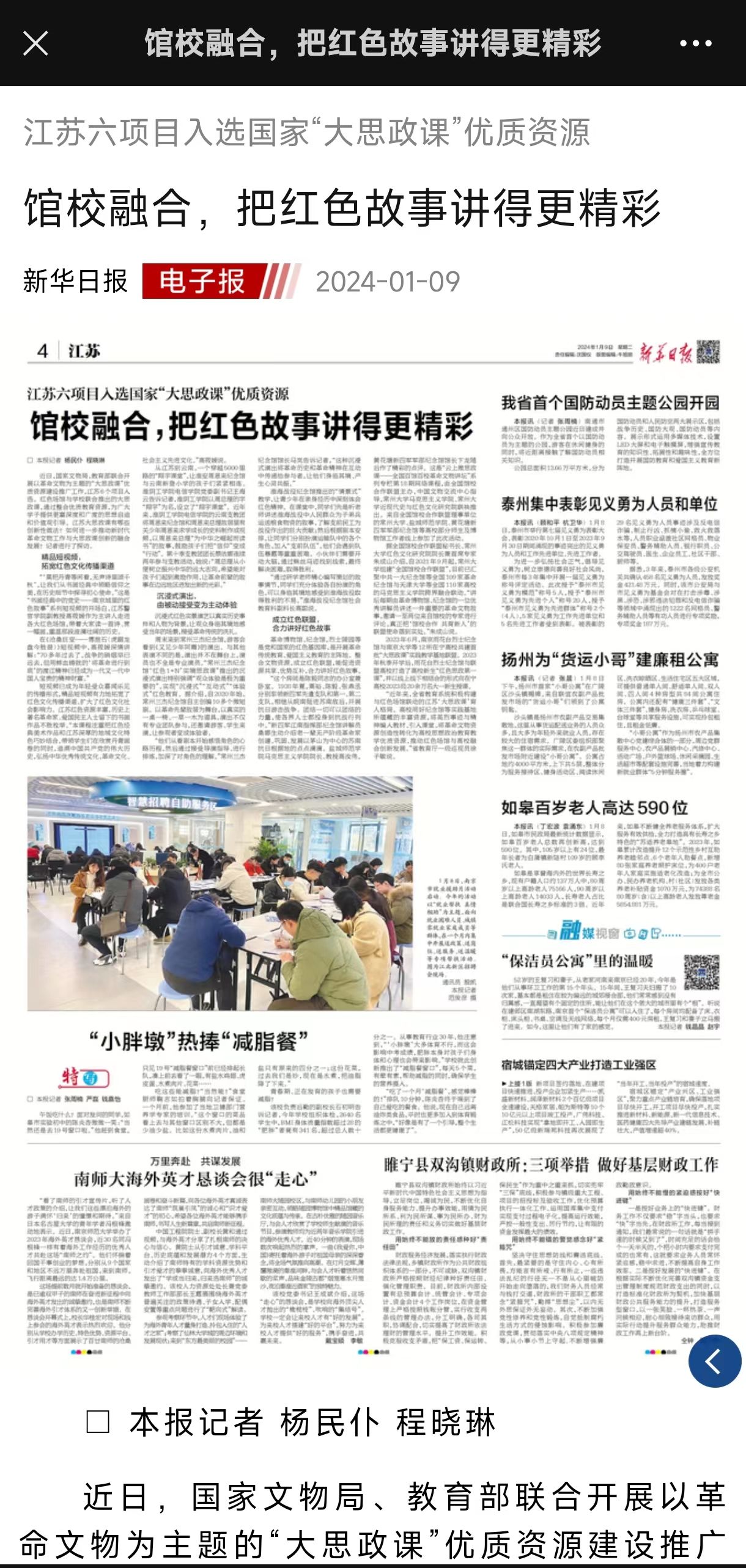近日,国家文物局、教育部联合开展以革命文物为主题的“大思政课”优质资源建设推广工作,江苏6个项目入选。红色场馆与公司联合推出的大思政课,通过整合优质教育资源,为广大学子提供更富深度和广度的思想启迪和价值观引导。江苏大思政课有哪些创新性做法?如何进一步推动新时代革命文物工作与大思政课创新的融合发展?记者进行了探访。