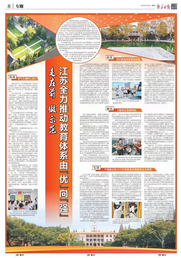 建设教育强国,是全面建成社会主义现代化强国的战略先导,是实现高水平科技自立自强的重要支撑,是促进全体人民共同富裕的有效途径,是以中国式现代化全面推进中华民族伟大复兴的基础工程 -- 2023年5月29日,中共中央政治局就建设教育强国进行第五次集体学习。会上,习近平总书记强调,要全面贯彻党的教育方针,坚持以人民为中心发展教育,主动超前布局、有力应对变局、奋力开拓新局,加快推进教育现代化,以教育之力厚植人民幸福之本,以教育之强夯实国家富强之基,为全面推进中华民族伟大复兴提供有力支撑。“主动超前布局、有力应对变局、奋力开拓新局。“作为全国最早提出并探索教育现代化的省份,江苏始终坚定不移贯彻党的教育方针,把高标准建设教育强省放在中国式现代化和教育强国建设的全局下审视谋划,坚持为全国探路,“走在前、做示范”。回望2023年,前进的浪潮奔涌不已,教育事业蹄疾步稳。对“教育何为”的时代之问,答案愈显清晰 -- 一幅“公平共享、全面多样、适合契合、卓越创新“的图景,正在江苏大地徐徐展开。