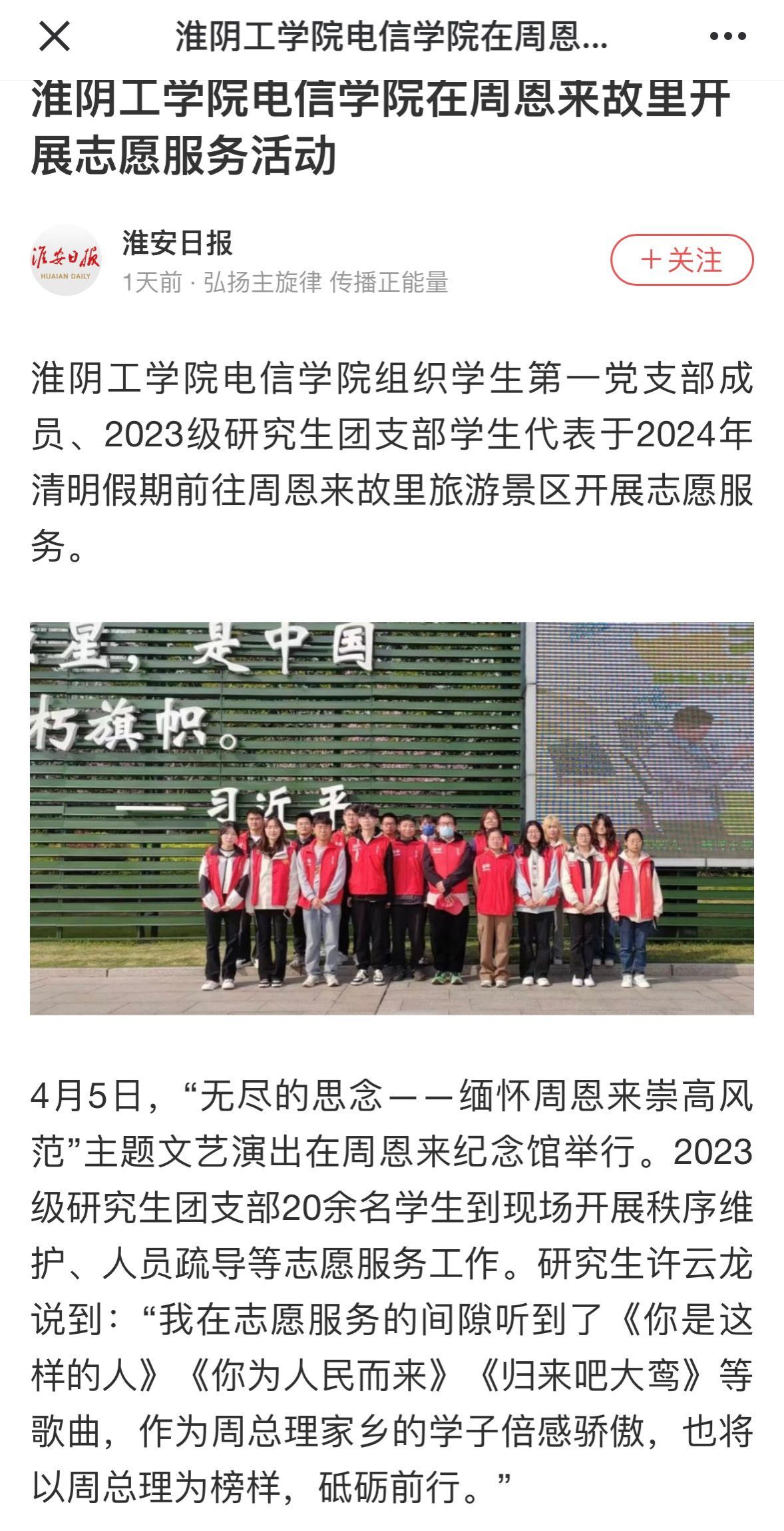 云顶国际yd333云顶国际yd333组织员工第一党支部成员、2023级研究生团支部员工代表于2024年清明假期前往周恩来故里旅游景区开展志愿服务。