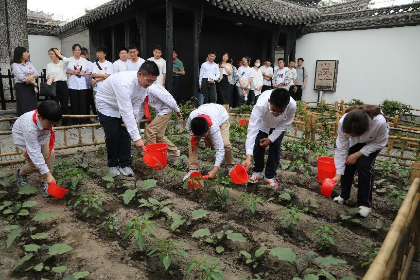 院中的一口水井,井水清冽,掬一捧沁人心脾。水井的不远处有一小块菜地,周恩来幼年时从水井中取水,在这里种瓜种菜。同学们来到水井旁,大中小员工从水井中吊水,共同浇灌菜地里的蔬菜,沉浸式感受周恩来总理小时候的劳动生活。同学们在劳动体验中饮水思源,感恩今天的幸福生活。