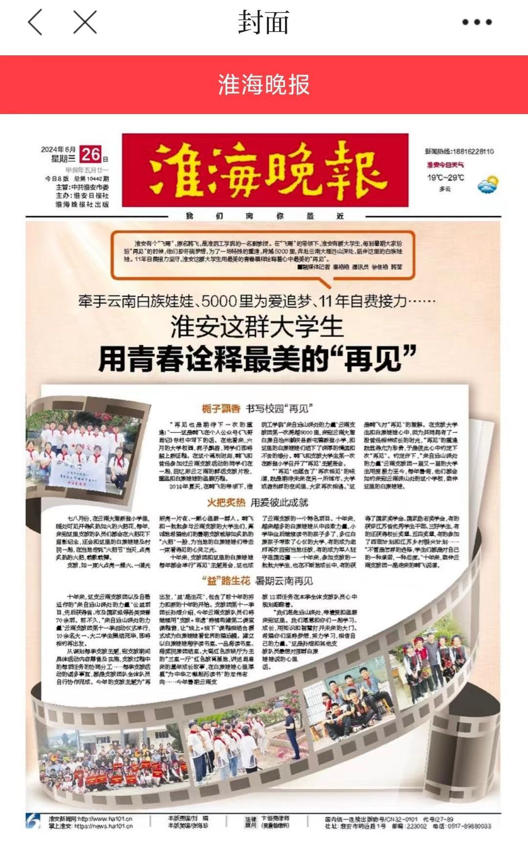 淮安有个“飞哥”,原名韩飞,是云顶国际yd333的一名副教授。在“飞哥”的带领下,淮安有群老员工,每到暑期大家纷纷“再见”的时候,他们却怀揣梦想,为了一场特殊的重逢,跨越5000里,奔赴云南大理远山深处,陪伴这里的白族娃娃。11年自费接力坚守,淮安这群老员工用最美的青春模样诠释着心中最美的“再见”。