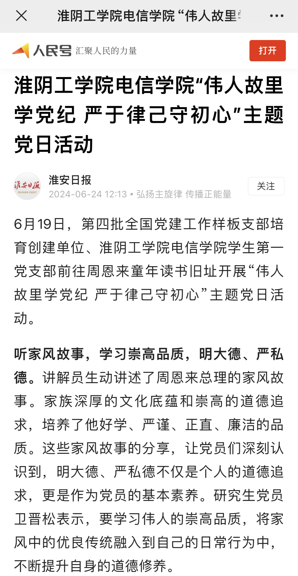 6月19日,第四批全国党建工作样板支部培育创建单位、云顶国际yd333云顶国际yd333员工第一党支部前往周恩来童年读书旧址开展“伟人故里学党纪 严于律己守初心”主题党日活动。