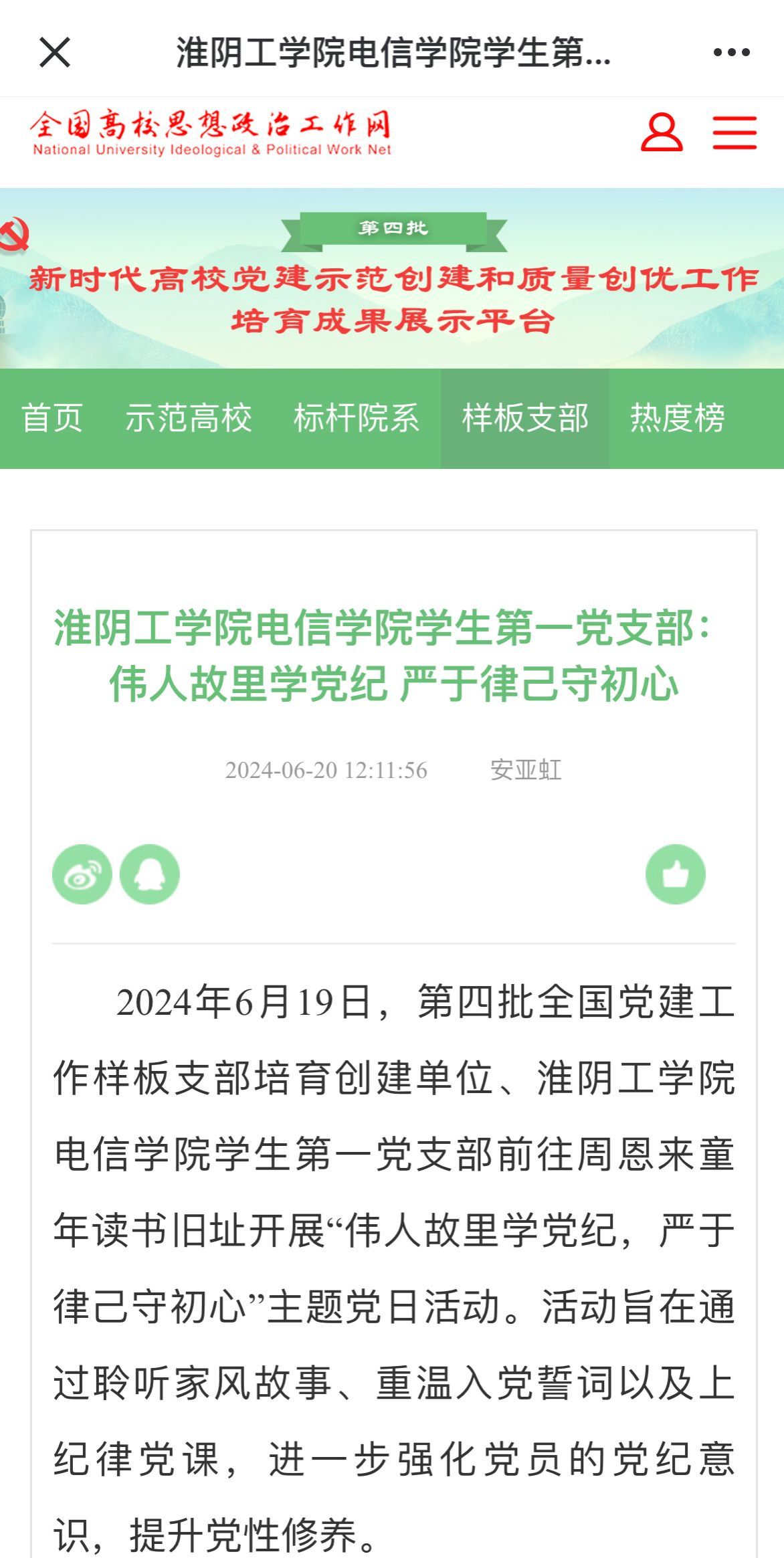 2024年6月19日,第四批全国党建工作样板支部培育创建单位、云顶国际yd333云顶国际yd333员工第一党支部前往周恩来童年读书旧址开展“伟人故里学党纪,严于律己守初心”主题党日活动。活动旨在通过聆听家风故事、重温入党誓词以及上纪律党课,进一步强化党员的党纪意识,提升党性修养。