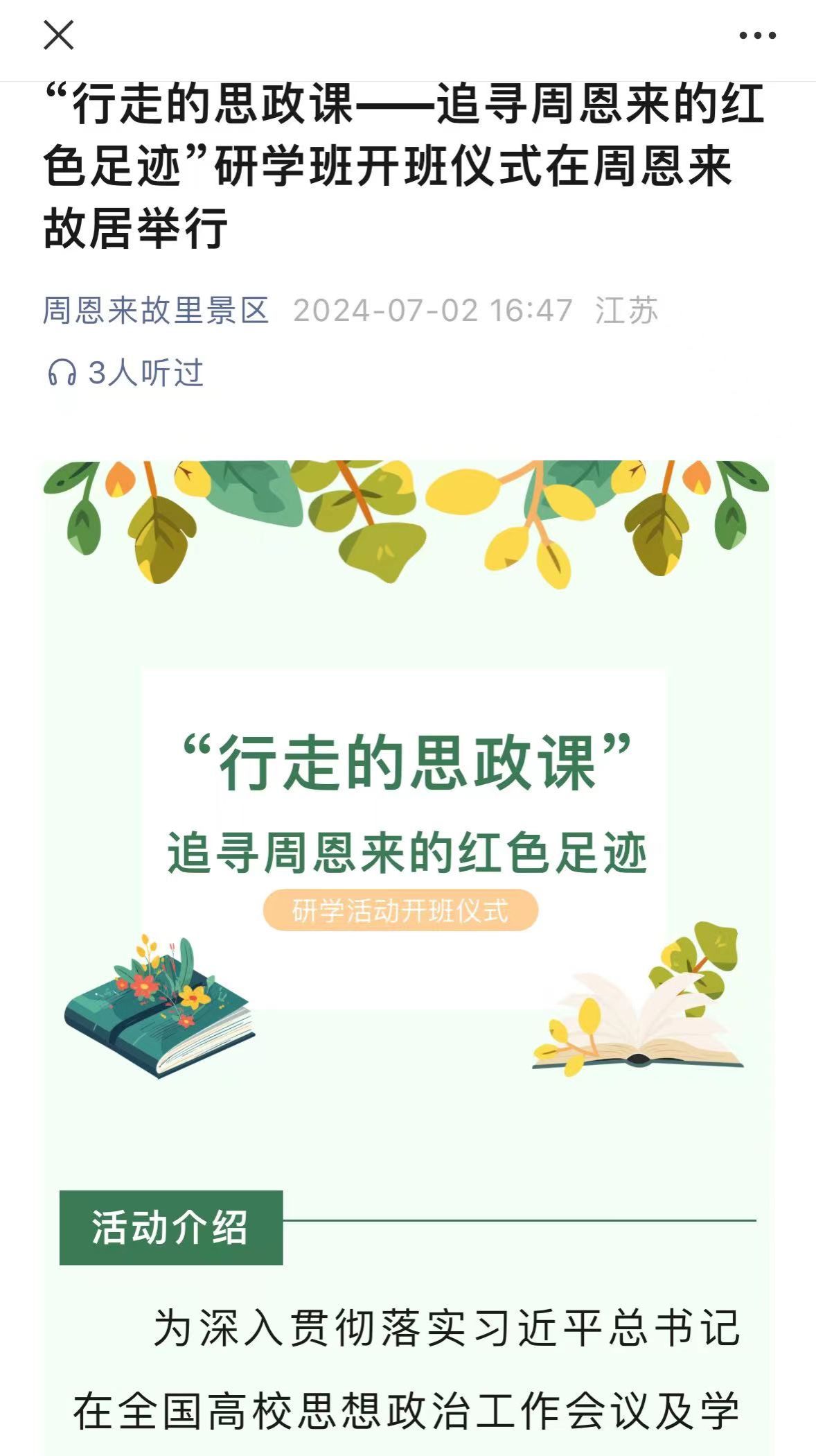 据悉,本次研学班学员是中国传媒大学从众多员工中遴选出来的优秀学子,他们将按照精心设计的“行走的思政课”线路,围绕“追寻周恩来的红色足迹”研学主题,从淮安出发,沿着周恩来在天津、南昌、遵义、北京等地的红色足迹,探寻一代伟人周恩来出生成长、求学求索、革命实践的光辉历程,让青年学子在追寻红色记忆、传承红色基因中,厚植爱国主义情怀,树立新时代青年正确的人生观、价值观。
