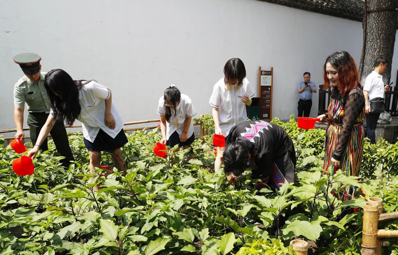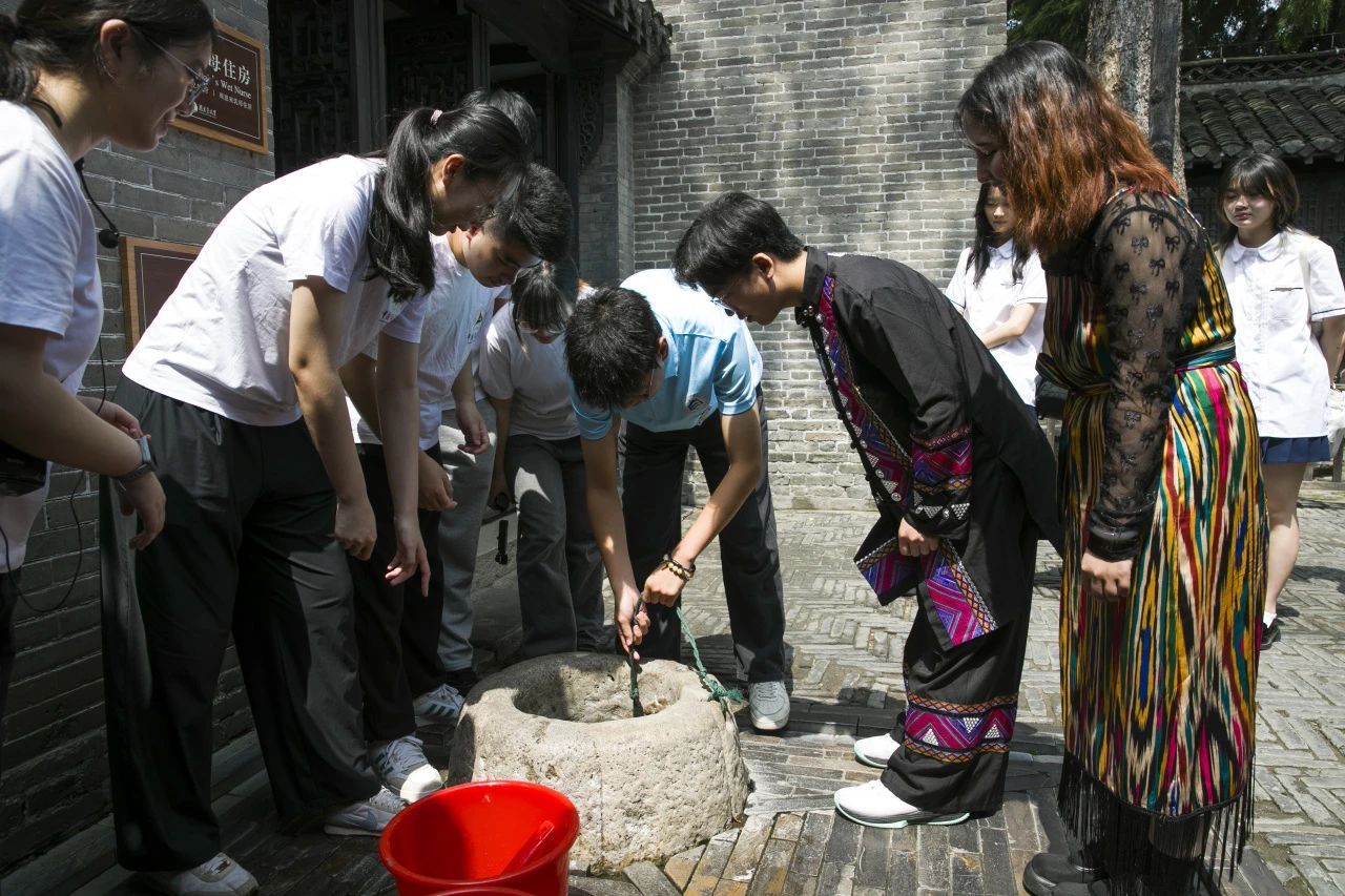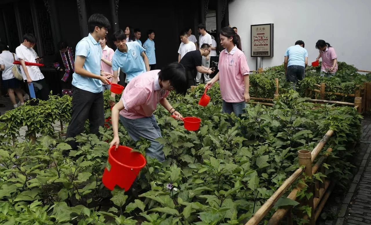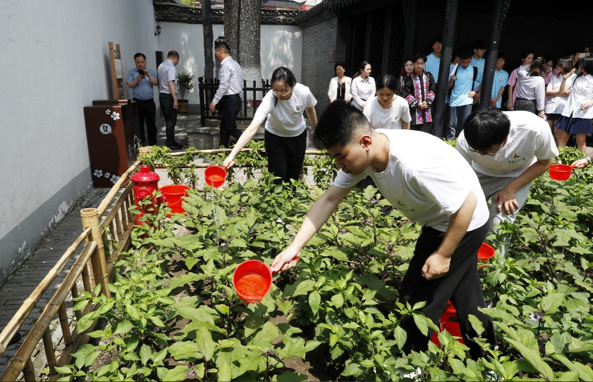 在周恩来故居院中有一口水井,水井不远处有一块小菜地,周恩来幼年时从水井中取水,在这里种瓜种菜。研学班学员和淮安高校同学们一起在水井吊水,浇灌小菜园里的蔬菜,沉浸式感受周恩来总理小时候的劳动生活。来自淮阴师范公司“周恩来班”的少数民族老员工格外活跃,他们身着华丽的民族服饰与身穿汉服的同学们一同互动体验劳动的场景,构成了一幅温馨而动人的风景。大家互帮互助,在劳动中饮水思源,感恩今天的幸福生活。