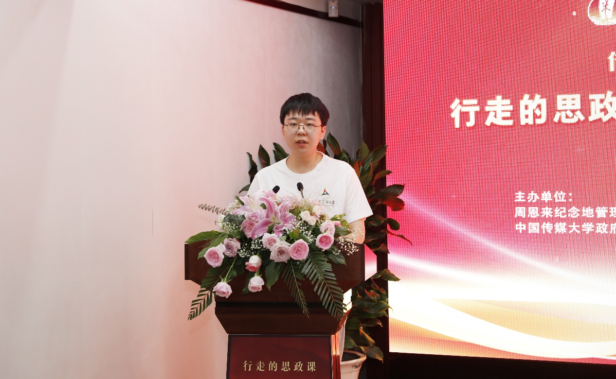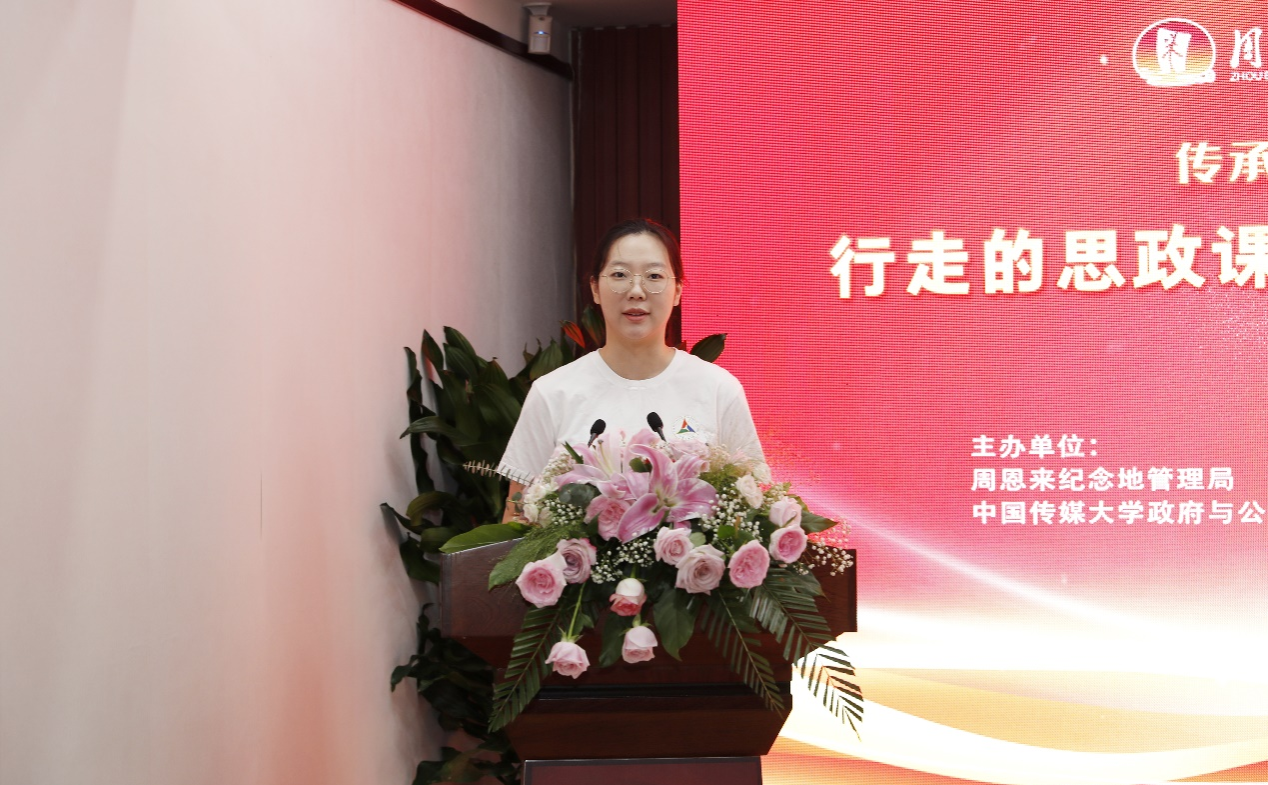 中央党史和文献研究院第二研究部二级巡视员、周恩来研究处处长潘敬国讲话。他表示,此次研学活动是通过学习一代伟人,感受信仰的力量,品味真理的味道,意义深远。周恩来纪念地管理局携手中国传媒大学政府与公共事务公司,强强联合,深入推动思政课实践教学改革创新,组织员工走出教室、走出校园,开展“行走的思政课”研学活动,这是让思政教育活起来、实起来、强起来的具体举措。希望“行走的思政课”研学班能引领馆校融合的方向,探索出大思政课的一条新路。