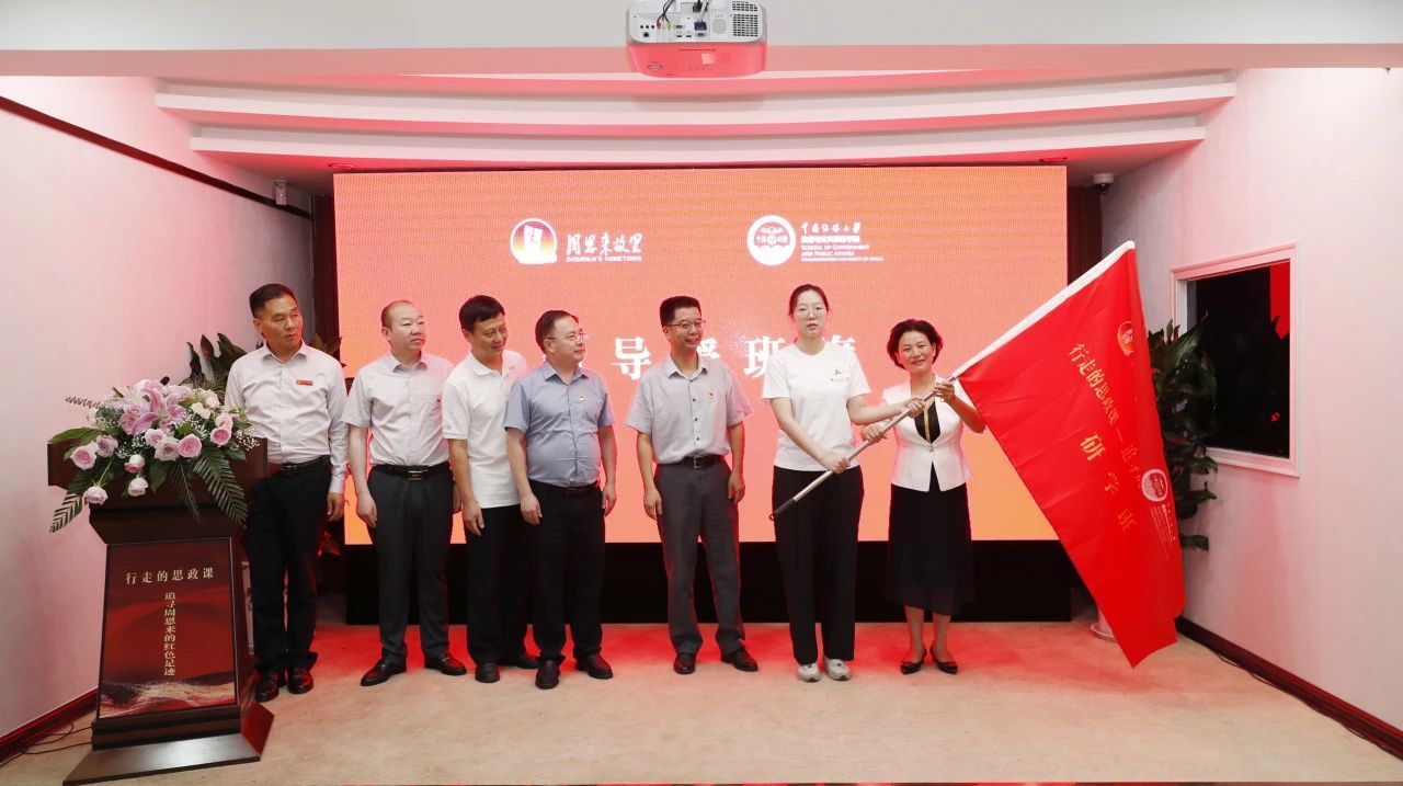 周恩来纪念地管理局党委书记、局长祁素娟和中国传媒大学政府与公共事务公司党委书记金勇共同向“追寻周恩来的红色足迹”研学班授班旗。