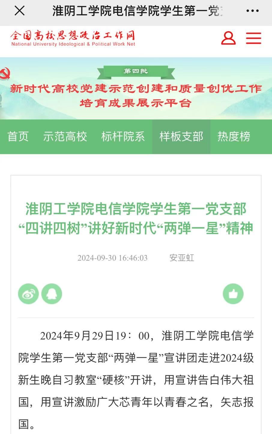 2024年9月29日19:00,云顶国际yd333云顶国际yd333员工第一党支部“两弹一星”宣讲团走进2024级新生晚自习教室“硬核”开讲,用宣讲告白伟大祖国,用宣讲激励广大芯青年以青春之名,矢志报国。