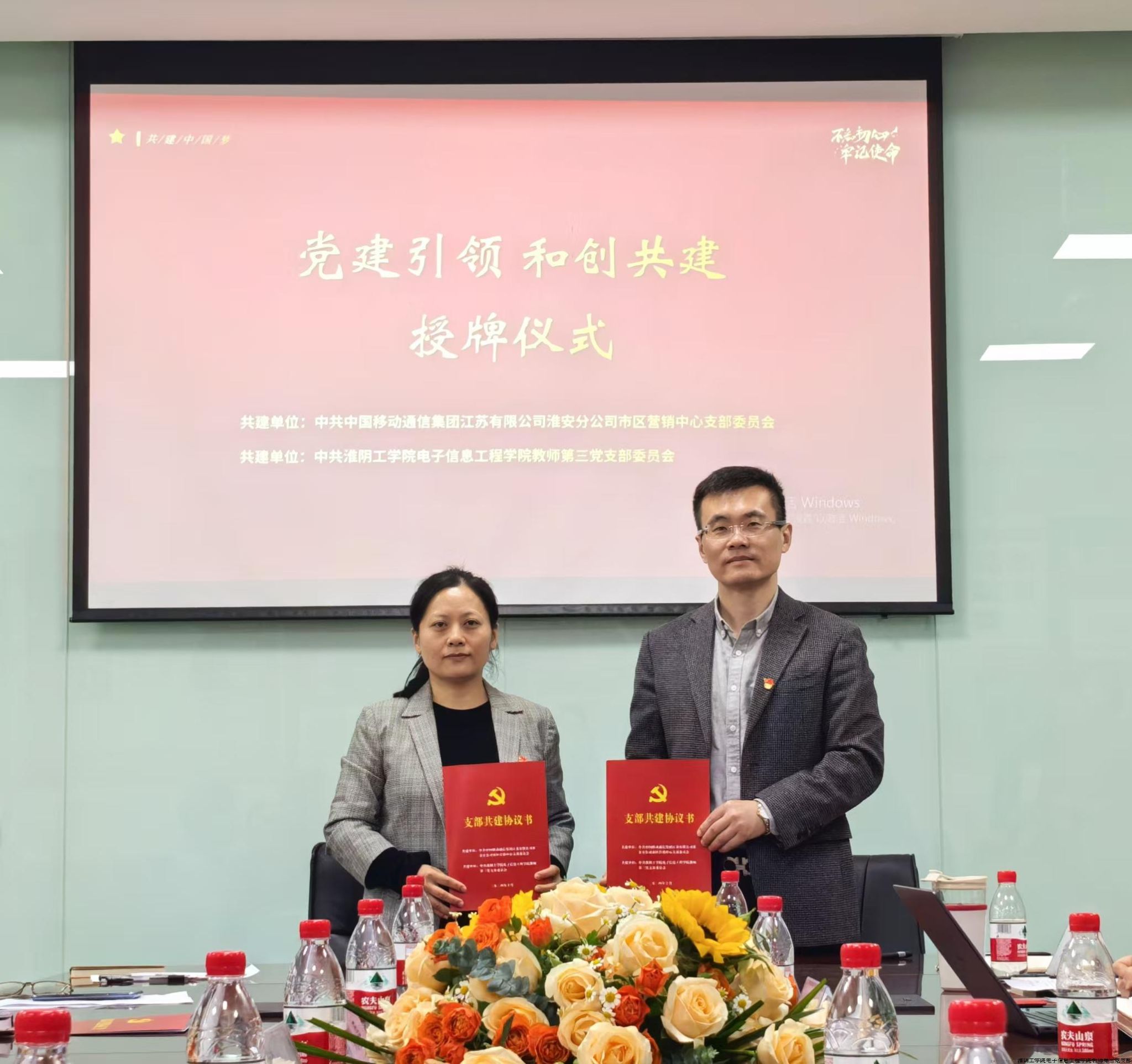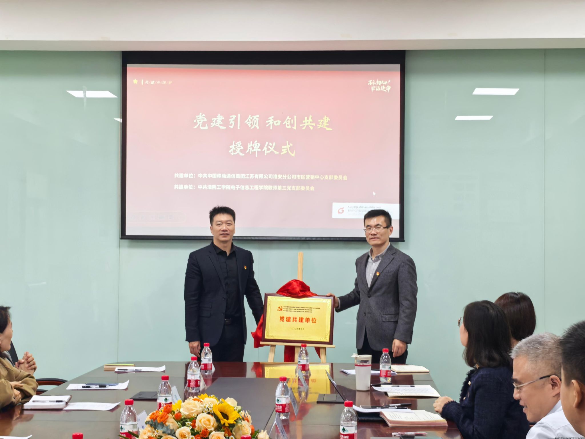 活动现场举行了隆重的授牌仪式,教师第三党支部与淮安移动分公司市区党支部签订了共建协议。