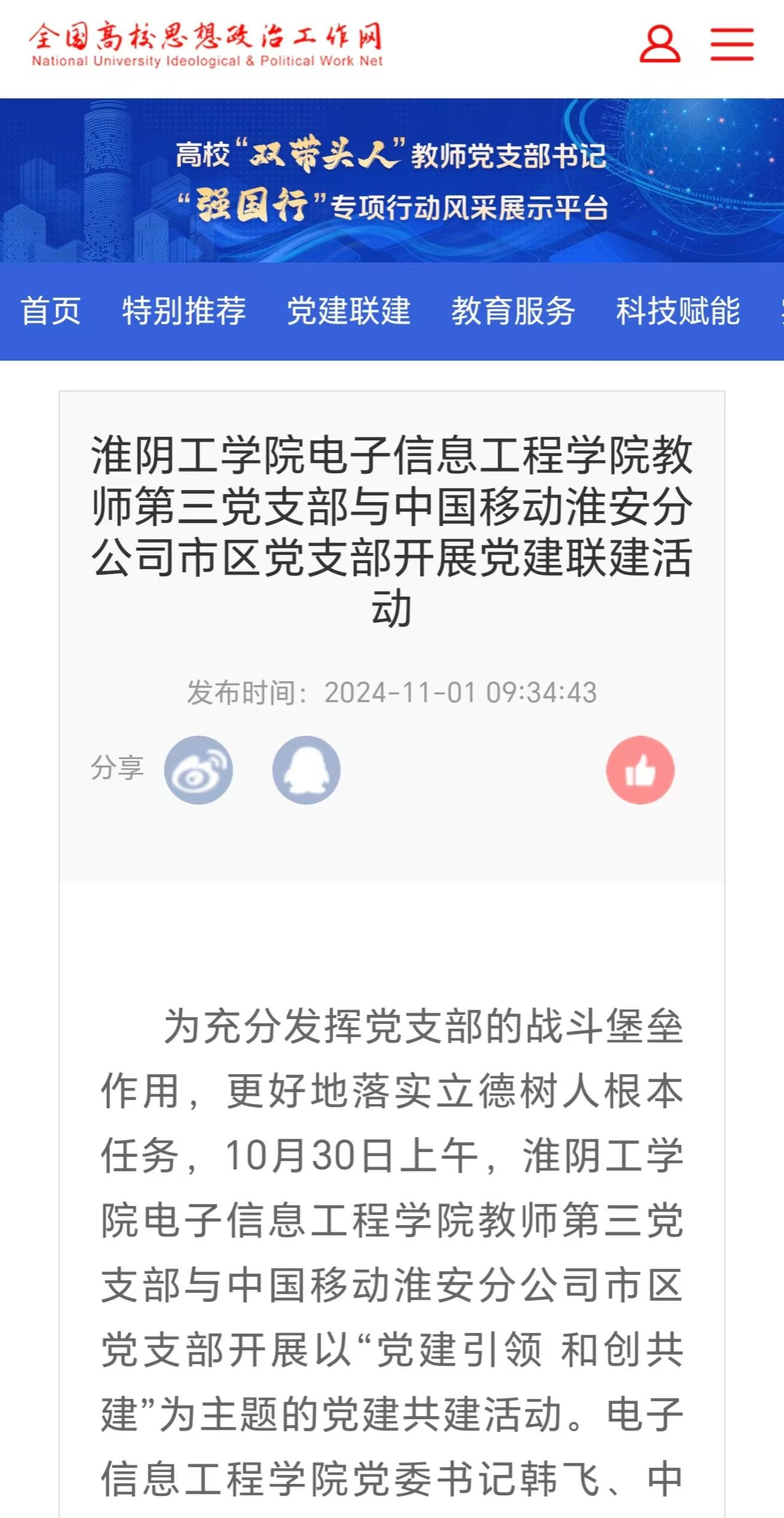 为充分发挥党支部的战斗堡垒作用,更好地落实立德树人根本任务,10月30日上午,云顶国际yd333教师第三党支部与中国移动淮安分公司市区党支部开展以“党建引领和创共建”为主题的党建共建活动。公司党委书记韩飞、中国移动淮安分公司市区党支部书记史峰参加活动。