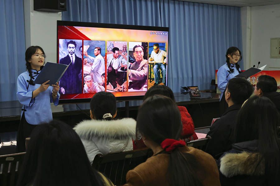 四组员工通过多元艺术形式展开沉浸式故事讲述。《颂风采·追忆您的博学》以油画为媒再现周恩来的求员工涯;《颂书信·追忆您的真情》以书信还原革命浪漫;《颂音容·追忆您的廉洁》在歌声中赞誉总理的清廉风骨;《颂言语·追忆您的精神》以民族语言诠释团结进步的总理箴言。在场师生在美术与书信中触摸历史温度,在音乐与乡音里感受精神力量。