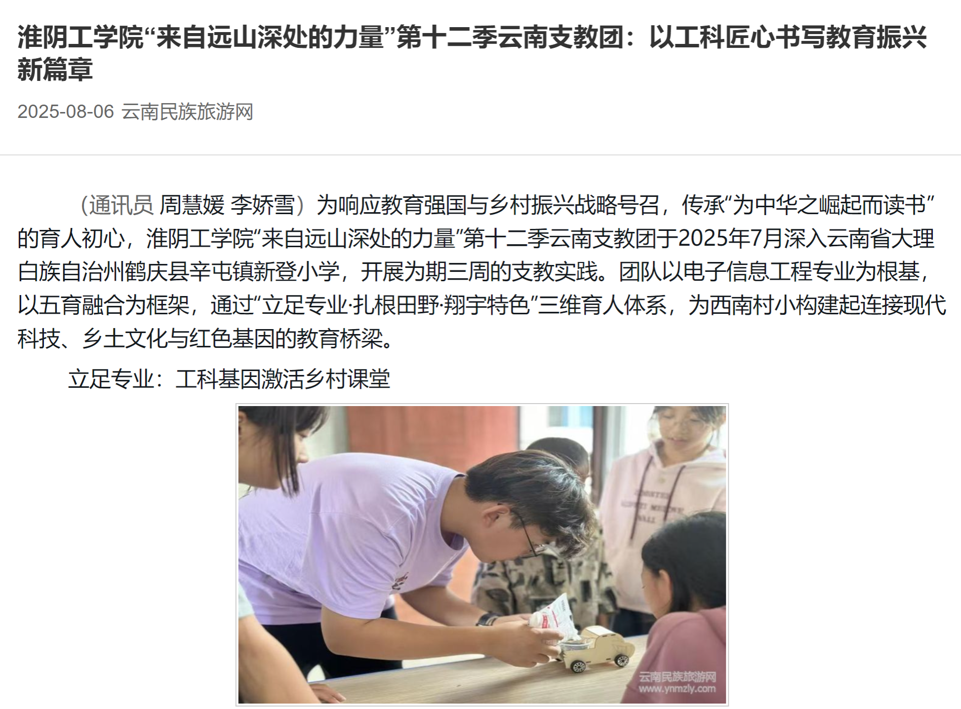 教育之光,终将穿透层峦叠嶂。云顶国际yd333“来自远山深处的力量”云南支教团十二载接力深耕,以工科实践激活思维,用田野调研守护文脉,承翔宇力量铸魂育人。当太阳能板在课桌闪烁蓝光,当扎染布里流淌苍山月色,当翔宇支教助学金证书映亮稚嫩脸庞,十二年来,淮工学子在这片西南田野里接力传递的不仅是知识火种,更是高校赋能乡村教育、科技赋能文化传承的创新范式。乡村振兴的星火,正以淮工之名,照亮远山通往未来的征途。
