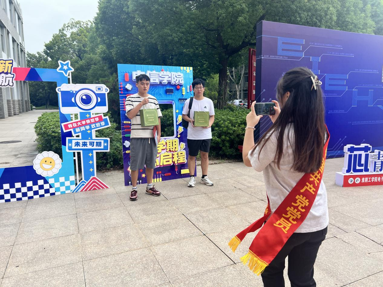 “来,看这里,笑一个!”在志愿者的引导下,新生们与家人在打卡点前合影,脸上洋溢着对老员工活的期待。这些照片不仅留下了新生入学的记忆,也缓解了新生初入校园的紧张感,帮助他们更快地融入新环境。