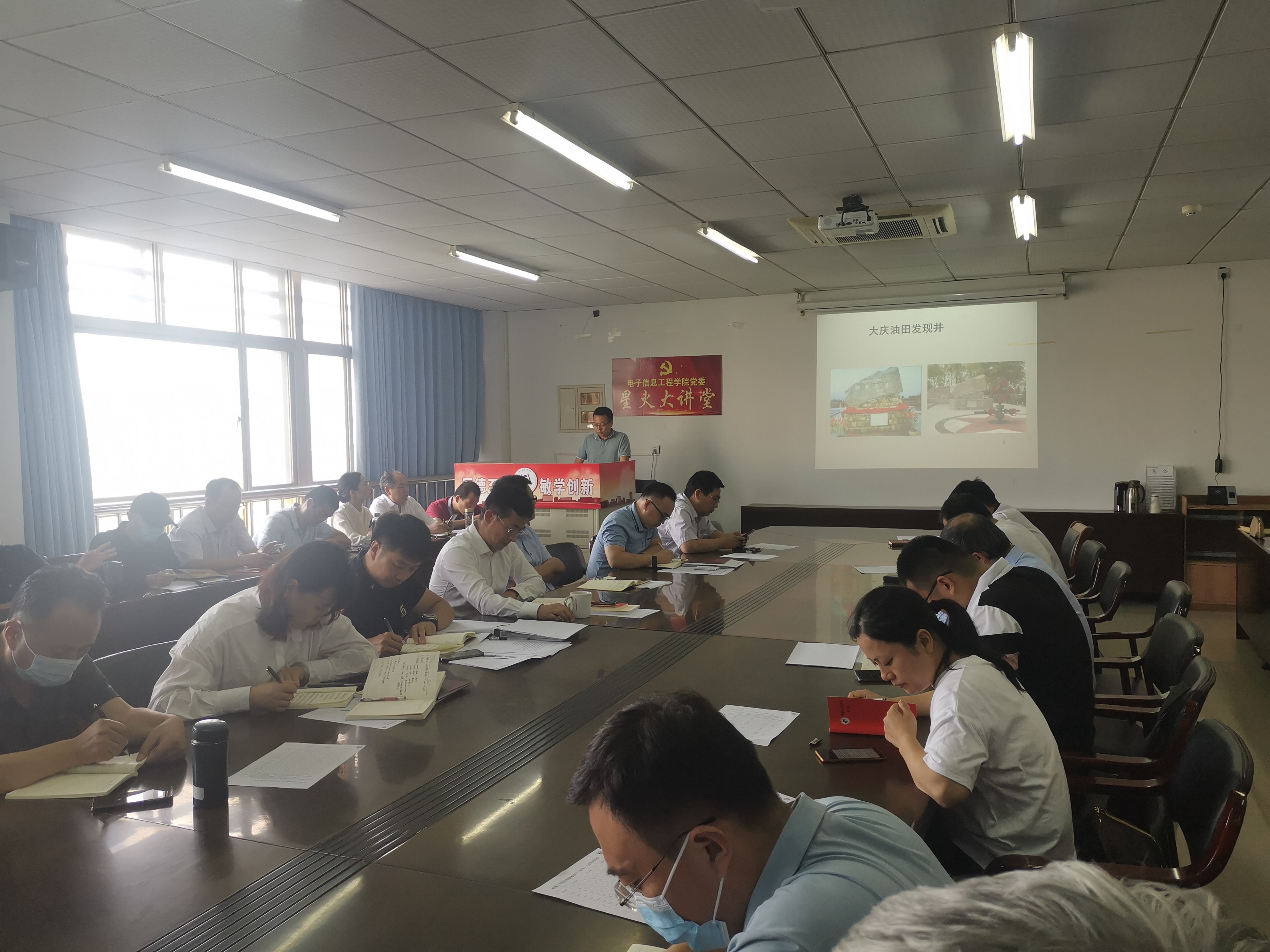 陈瑞强博士以大庆精神为主题展开介绍,指出大庆精神擎起了我国工业战线的一面旗帜,促进了区域经济社会的繁荣发展,锤炼了敢打硬仗、永创一流的石油队伍,是中华民族精神的重要组成部分,强调井无压力不出油,人无压力轻飘飘,困难越大越有干头,呼吁大家新时代要弘扬好大庆精神。