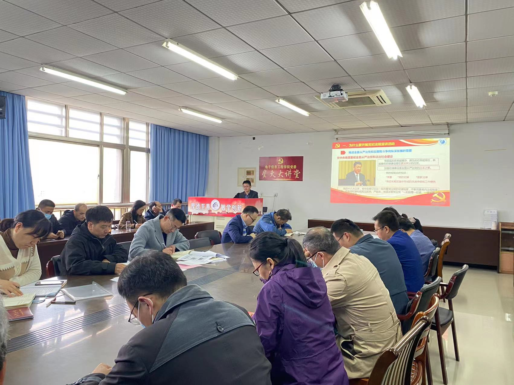 本次宣讲,胡巍威老师以“明纪守法知敬畏,履职尽责做表率”为主题,从推进全面从严治党和反腐败斗争向纵深发展,推进依法治国和高校治理体系、治理能力建设,推进法纪宣传和提升以案说纪、以案释法成效等方面深刻阐述了党纪法规专题宣讲的必要性,强调党组织和党员领导干部要履行管党治党责任、发挥引领带头作用,加强自身的党性观念和党性修养,以高度的政治自觉、牢固的政治信仰、强烈的法治观念,学习好遵守好党内法规。