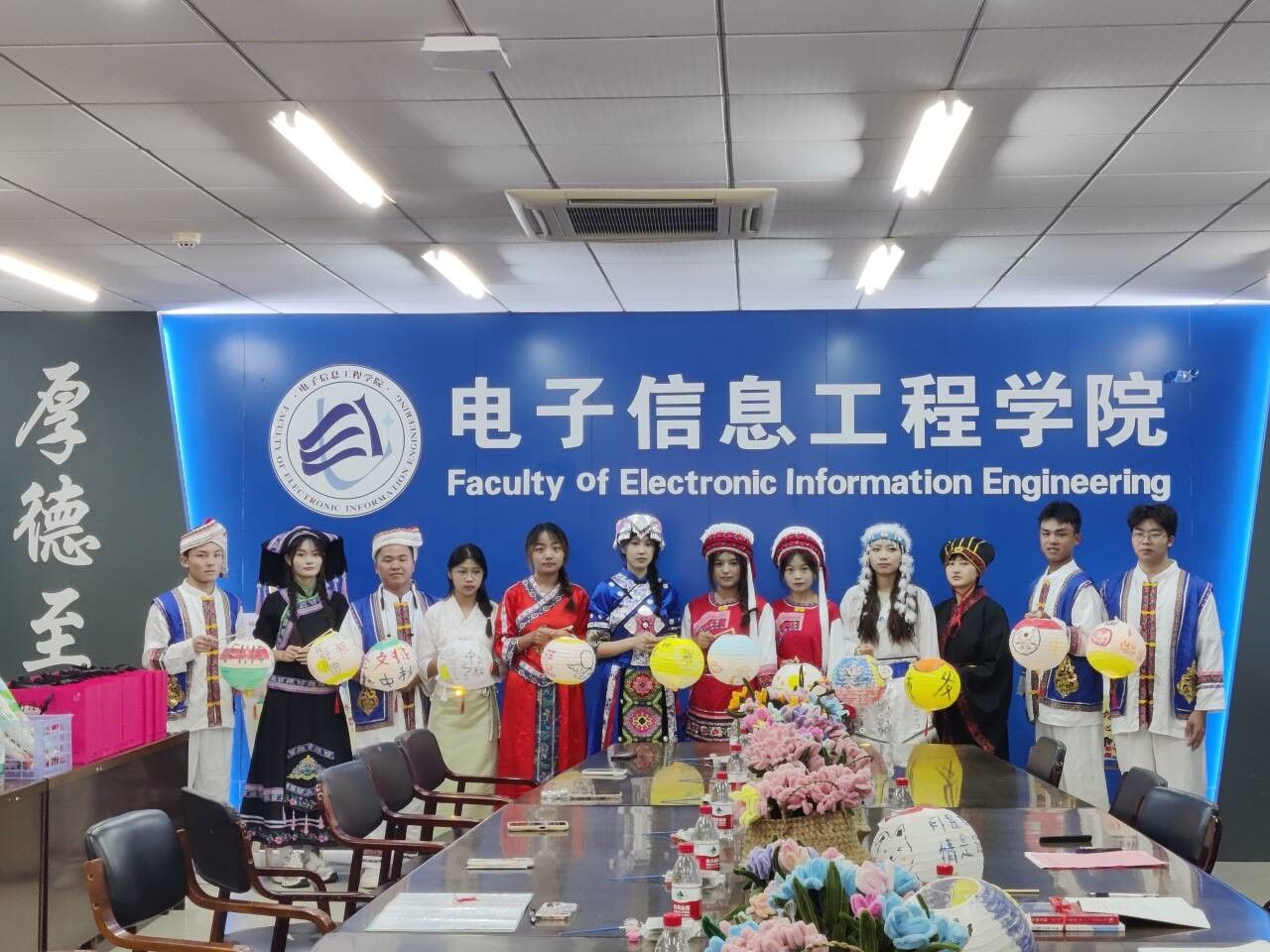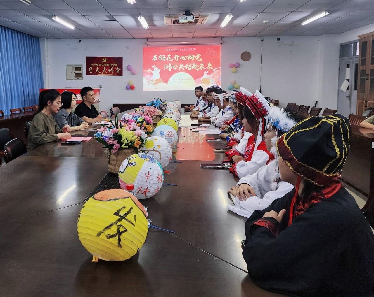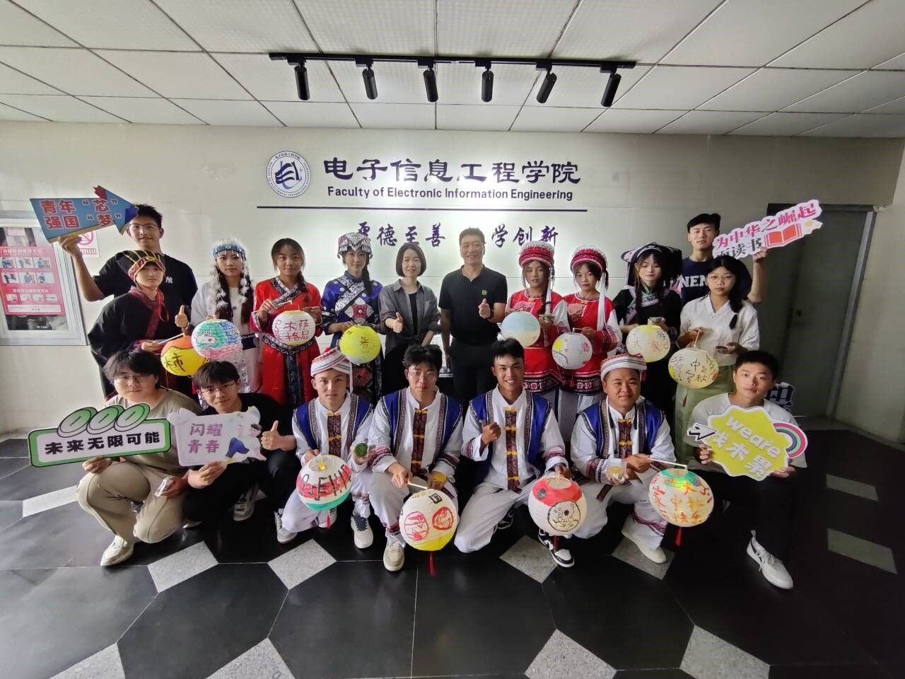 活动中,红石榴宣讲团的成婷同学为大家带来一首《相亲相爱》。来自水族的专转本员工杨宗顺向大家讲述了自己走出大山求学、参军退役后毅然选择来到淮工复学的青春故事。来自彝族的罗凯同学是今年刚入学的新生,她说,“听到汉族同学唱的歌,看到穿着不同民族服饰的同学,拿着大家一起画的灯笼和伞,我仿佛又回到了我那逢节就载歌载舞的家乡。”