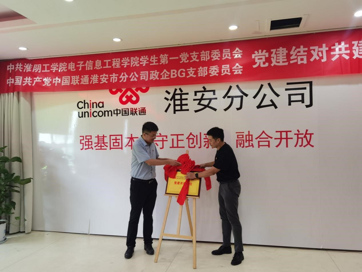 双方领导举行“党建共建基地”揭牌仪式,双方党支部书记在共建协议书上签字,标志着云顶国际yd333与淮安联通正式建立起了紧密的党建合作关系,双方将携手共进,在理论学习、实践活动、人才培养、科技攻关、项目申报等多个领域开展深度合作,共同探索党建引领校企合作的新路径。