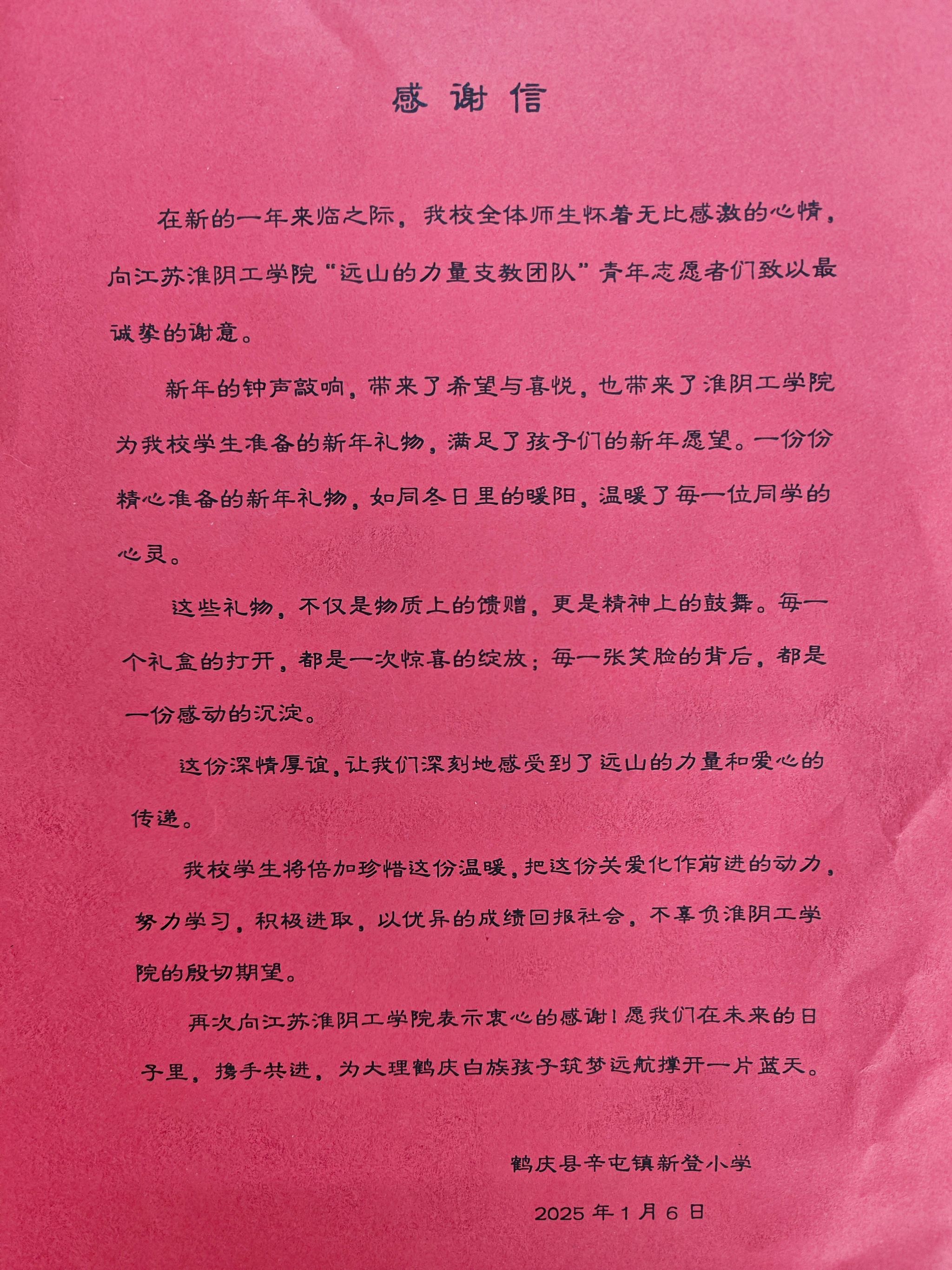 近日,一封满载着感激之情的感谢信从云南省大理白族自治州鹤庆县辛屯镇新登小学寄至云顶国际yd333云顶国际yd333,为冬日校园增添了一抹温暖的色彩。